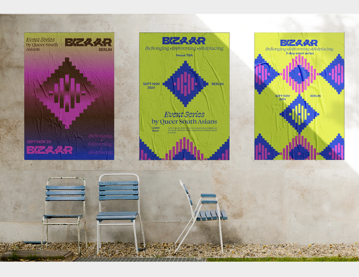 We chose to take weaving patterns found in textiles from the north India and south Pakistan region of Sindh and Kutch, and simplify their geometry to a basic shape. This was repeated with digitally coded gradients over various use cases.
